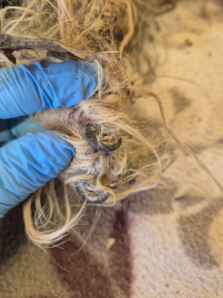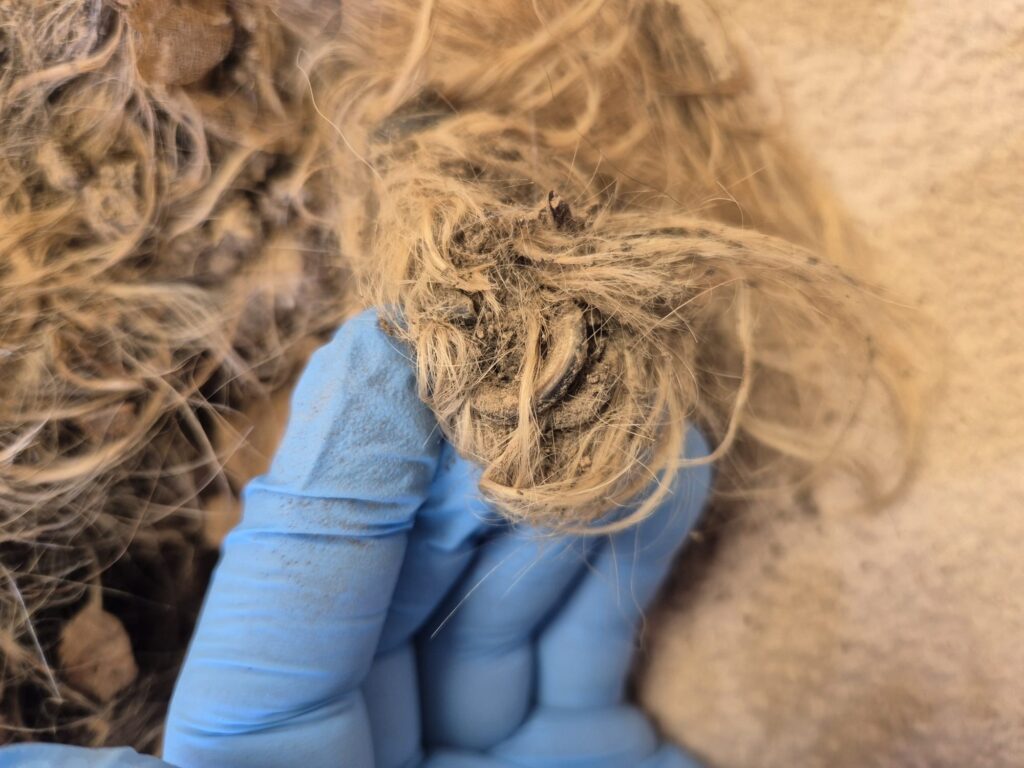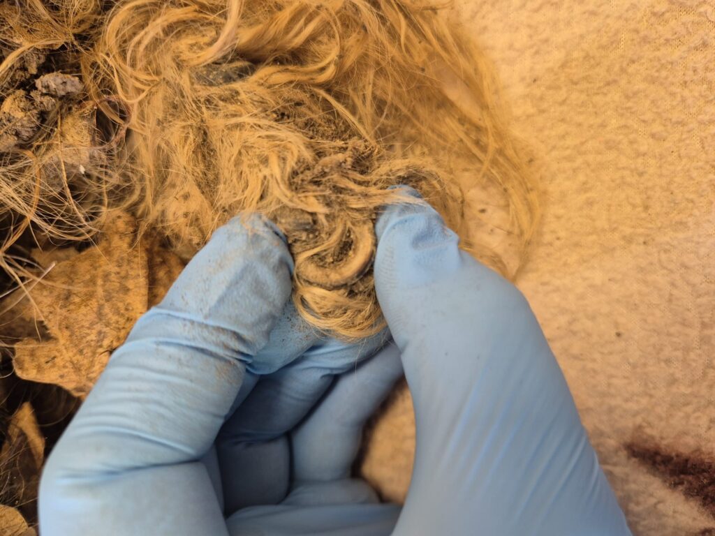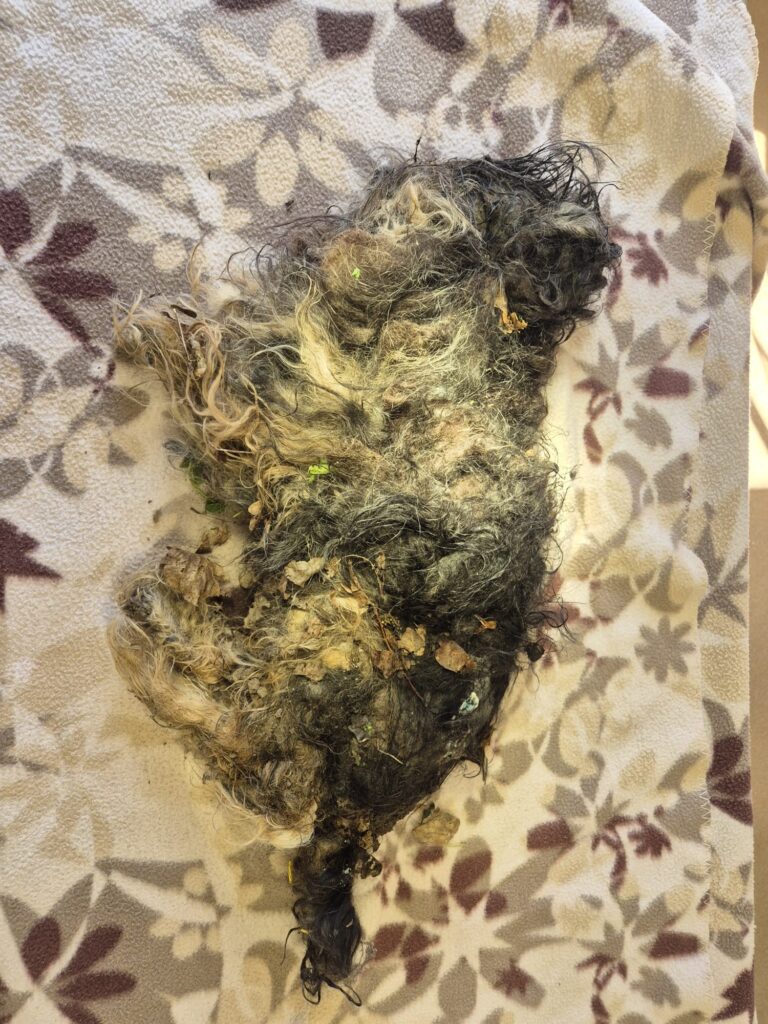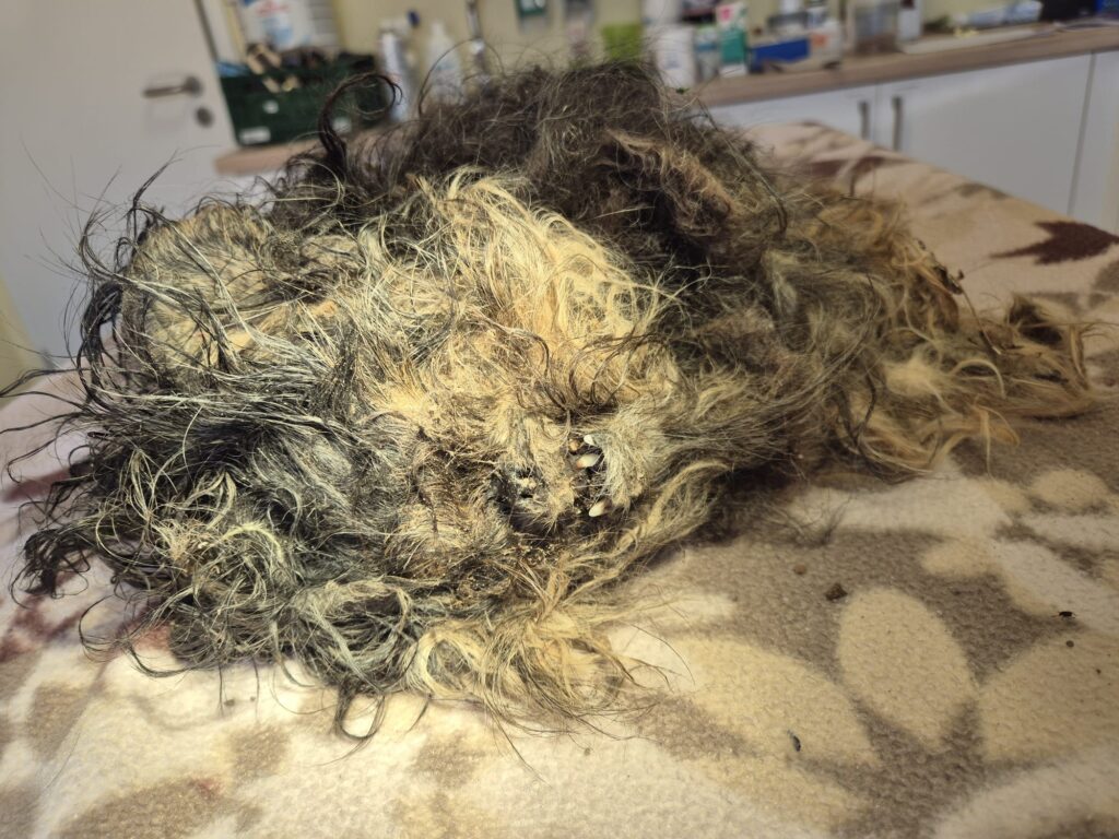 Es lag eine Hundetragetasche daneben. Der Hund ist in einem sehr schlechten, verwahrlostem Zustand.